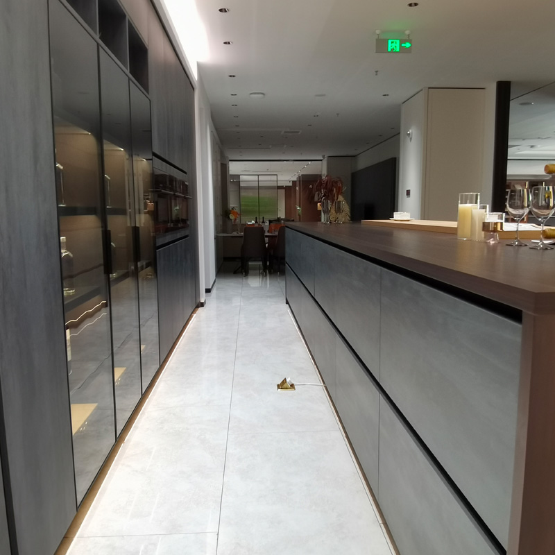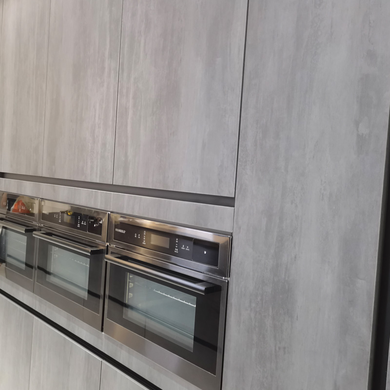 바위 풍화와 같은 색상 오래된 처리로 새로운 스타일의 유행 산업 적층 부엌 캐비닛, 터치 느낌이 부드럽고 품질, 유리 도어 패널과 알루미늄 프레임이 일치하여 부엌 장식 효과의 높은 감각을 만듭니다. 소재는 방수가 되어 청소가 쉽고 스타일이 쉽게 나오지 않습니다.